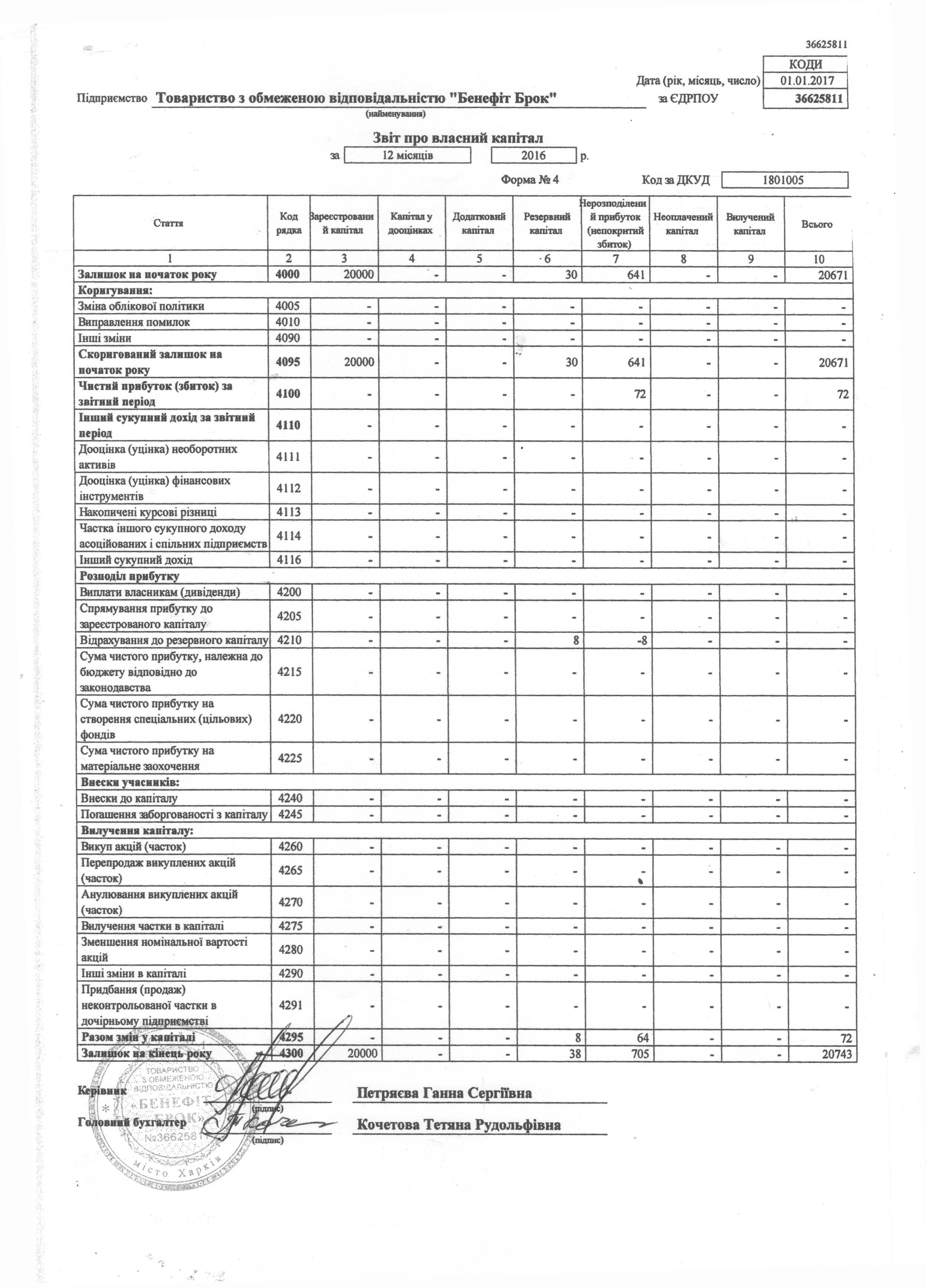 ЗВІТ ПРО ФІНАНСОВІ РЕЗУЛЬТАТИ ТОВ “Бенефіт Брок” за 2016р.