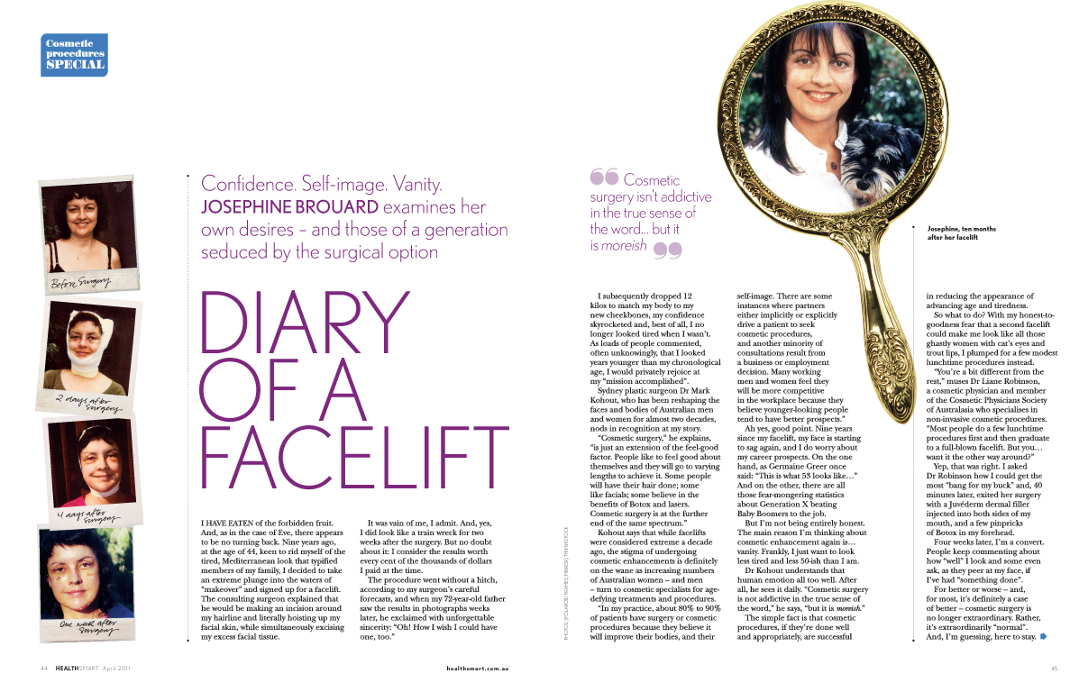 For HealthSmart magazine, final offerings (before the magazine died) include a piece about The Last Act of Love - viz. preparing a parent for death - and a personal take on the trend to cosmetic surgery. I also have a regular Guest Column where I discuss how to live, and recently reviewed a beautiful retreat for Belle magazine.